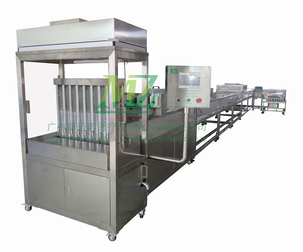 真空采血管生產設備自動化流水線性能說明 (1) 真空采血管生產結合國內實際生產需求,設計生產的真空采血管自動裝管,促凝劑加藥噴霧、烘干、蓋帽、抽真空壓帽、取管、裝托盤的全自動化機械設備; (2) 該機全部采用可編程控制,氣動執行機構。根據真空采血管的生產特點,通過程序軟件將所有的機械執行動作有機組合控制; (3) 該機配備自動熱收縮包裝機,可實現包裝自動化,達到全自動化組合生產的目的;